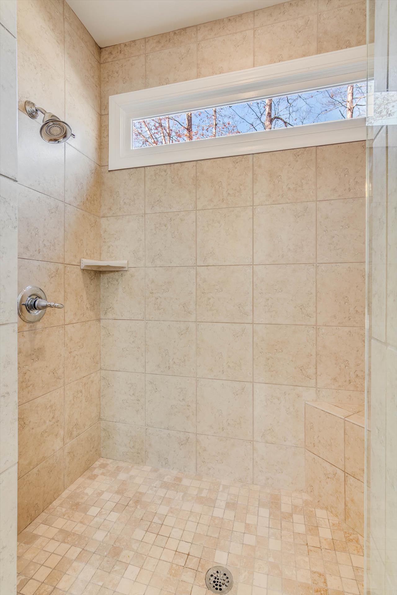 There are 5 bedrooms (see below), 4 full bathrooms and one half bathroom. This house has plenty of of beds-- located on 3 floors which allows for some privacy. (Upstairs room with single beds must access bathroom through a bedroom or go downstairs.) The main living room has a wall of windows overlooking the trees and lake view through the trees, beautiful hardwood floors, a stone fireplace and vaulted ceilings.