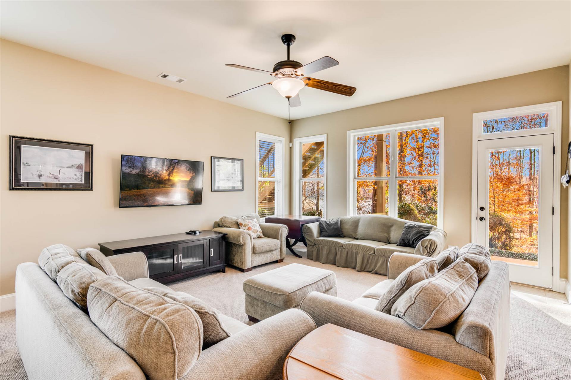 For outdoor living, there are three deck areas – two covered decks--one with 3 ceiling fans--and a deck by the outdoor kitchen and fire pit. For entertainment, there are board games, a large flat screen, smart TV with Blu-Ray player and a shuffleboard table on the terrace level.